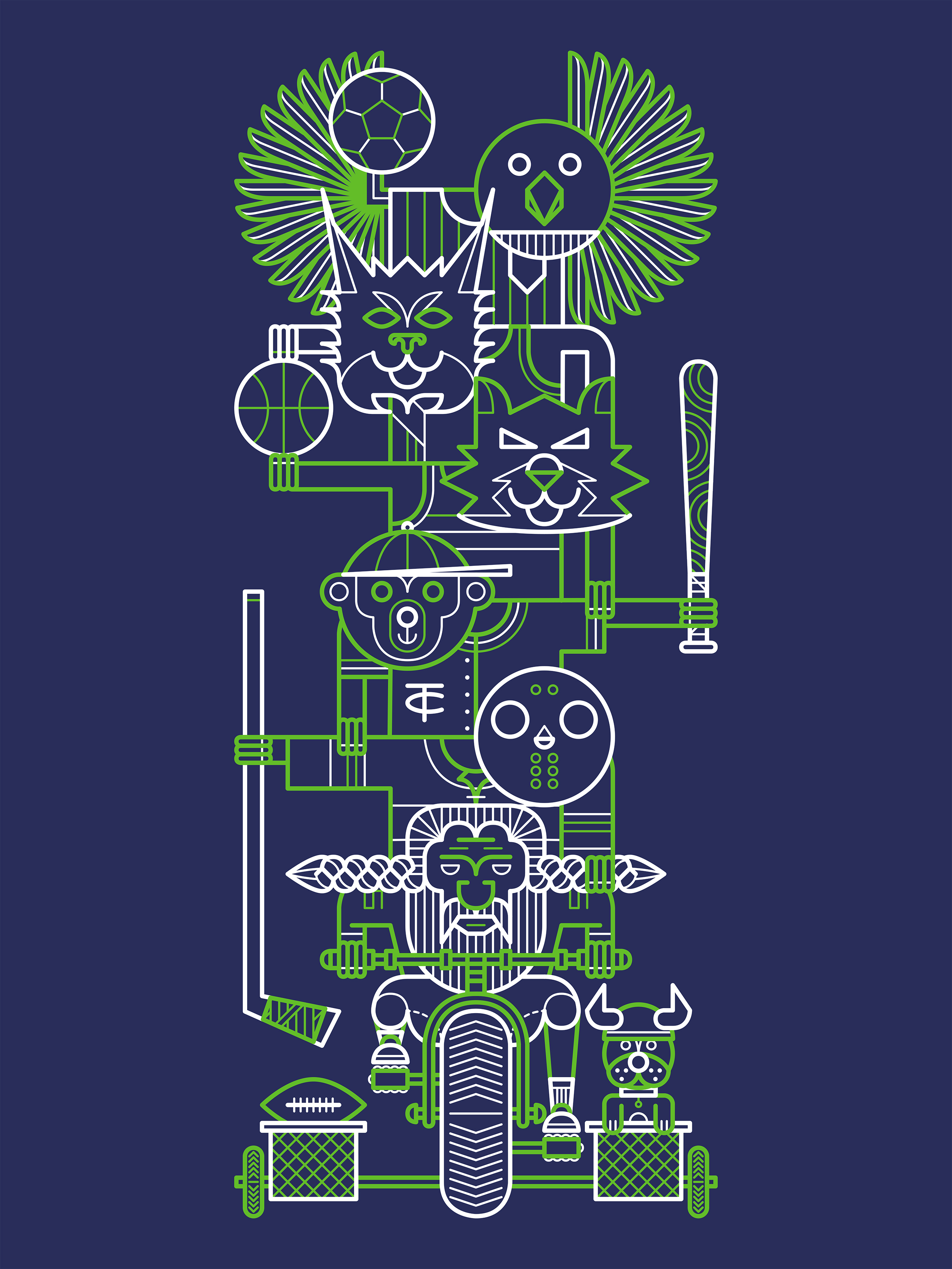 For me, all sports have always been the great equalizer. It's really the only place where you are judged on your passion and skills, not on who you are, where you came from or what you believe. Thus my idea was combining all the major sports from Minnesota (Vikings, Wild, Twins, Timberwolves, Lynx and United) and having them ride a single bike. These handmade screen printed posters were produced at CHUX Print in St. Louis Park, and utilized a two-color ink system.